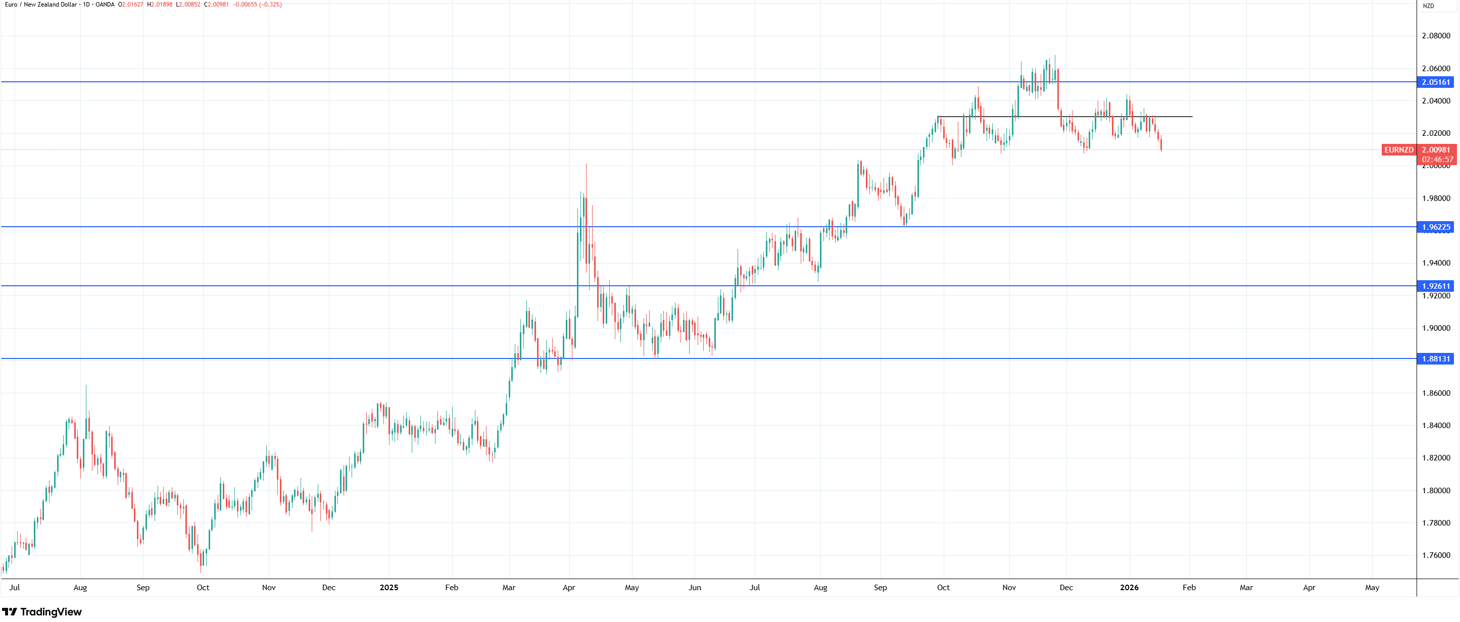 EUR/NZD peaked in November and has since formed a head-and-shoulders pattern with a baseline around 2.007.