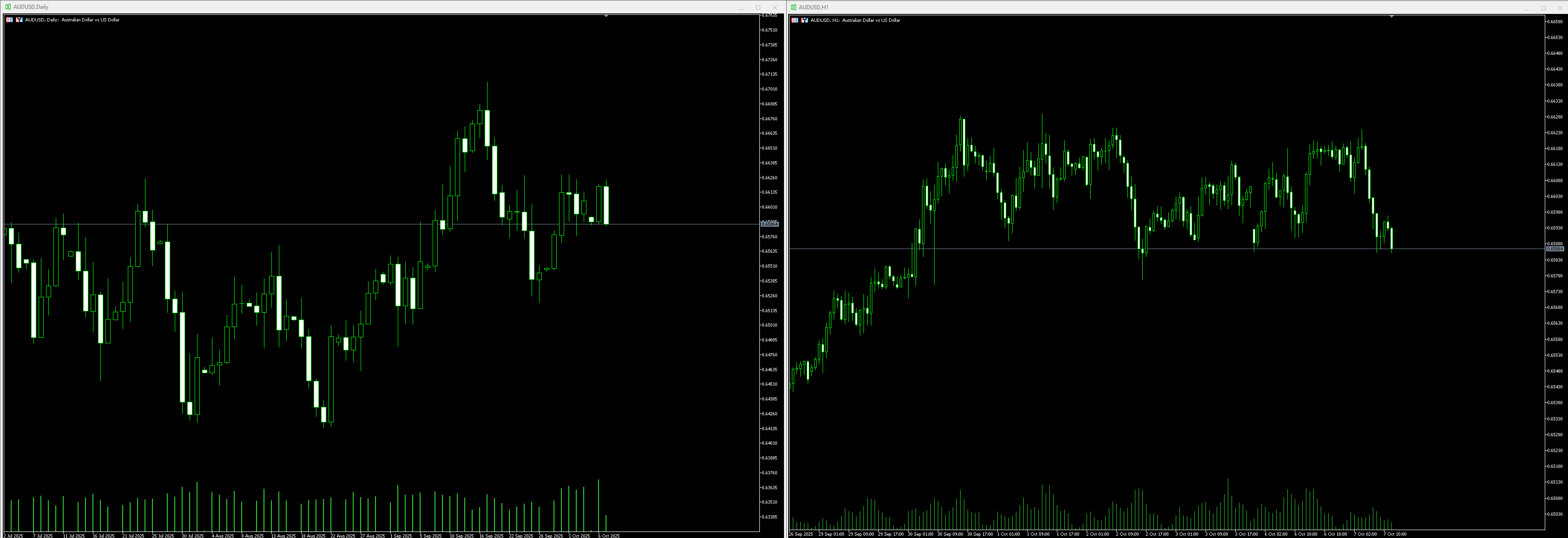 AUD/USD daily and hourly chart side-by-side, Source: MetaTrader 5