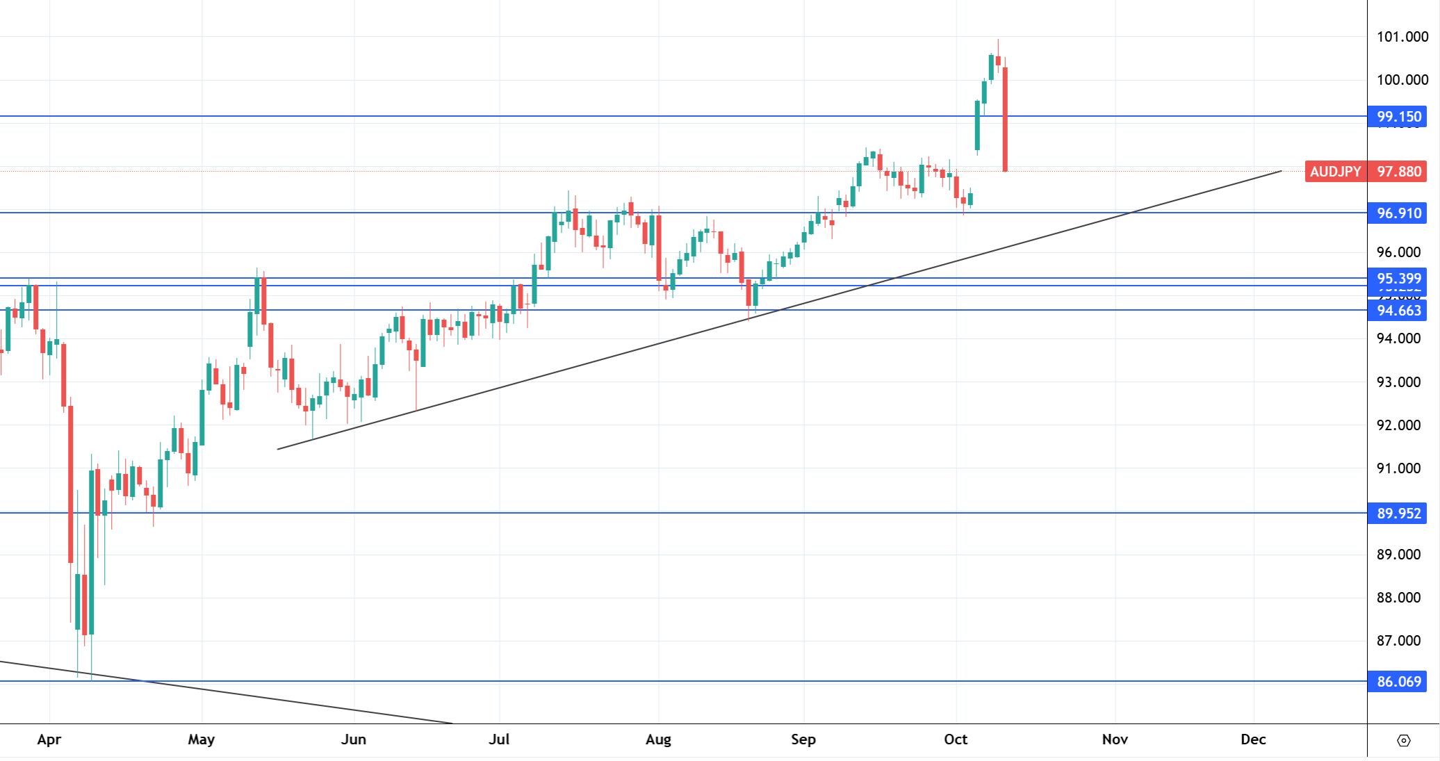 AUD/JPY daily chart with a lower trendline, Source: TradingView
